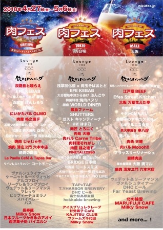 2018年4月27日(金)~5月6日(日)の10日間、東京<お台場特設会場>・大阪<長居公園>・広島<旧市民球場跡地>の3会場で同時開催するGWの風物詩「肉フェス」の出店全ラインナップが解禁いたしました。第3弾は各会場全国のブランド牛をはじめとする絶品ステーキの数々と、今年注目のラム肉や鴨肉、そしてヘルシー志向の心強い味方 鳥料理などが各会場を賑わせます。締めのスイーツ勢も一挙公開!