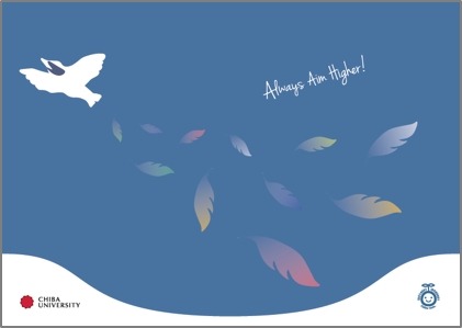 表面のデザインは環境ISO学生委員会の学生(教育学部3年)の内山桜さんが担当しました。上空を目指す鳥は千葉大学の理念である「つねに、より高きものをめざして(Always Aim Higher)」を象徴し、11枚の羽は千葉大学の10学部と大学院を表し、鳥と羽を合わせて、全学が一丸となって高みを目指す姿をイメージしています。
