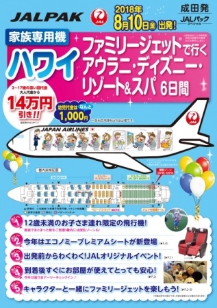株式会社ジャルパック(本社:東京都品川区、代表取締役社長:藤田克己)は、8月10日(金)出発限定で、お子さま連れのご家族専用のJALチャーター機で行くハワイ6日間のツアー「ファミリージェット(R)で行く アウラニ・ディズニー・リゾート&スパ」を4月5日(木)より発売開始いたします。