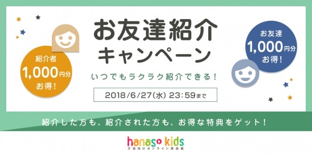 株式会社アンフープ(所在地:静岡県富士市、代表取締役社長:重森 渉)がサイト運営する、無料通話ソフトSkype(スカイプ)を利用したオンライン英会話スクール「hanaso kids」では、2018年4月3日(火)~6月27日(水)に「お友達紹介キャンペーン」を実施いたします。