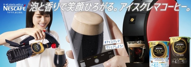 ネスレは、簡単なボタン操作で、1杯ずつ本格カフェメニューが楽しめる「ネスカフェ ゴールドブレンド バリスタ」や、今春より販売を開始した「ネスカフェ ゴールドブレンド ハンディ アイスクレマサーバー」(※参考資料)で作る、アイスコーヒーの上にきめ細かいクレマ(泡)がのった「アイスクレマコーヒー」を通じて、皆様に新しいアイスコーヒーの楽しみ方を提案しています。