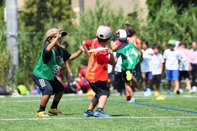 独特の浮遊感があるので比較的捕りやすく、ディスクなので子供でも簡単に握ることができて投げやすいと言われております。今回のイベントでは、フライングディスク体験を通して距離感をつかむ能力や軌道を把握する能力、ボールへ向かっていく気持ちを楽しみながらも養われることが期待できます。