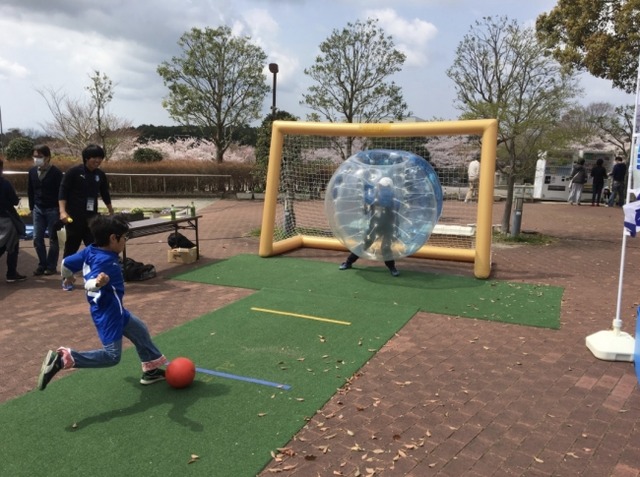 2018年4月1日(日)、沼津市愛鷹広域公園多目的競技場にてアスルクラロ沼津のホームゲームとして開催された明治安田生命J3リーグ第5節(カターレ富山戦)のスタジアム外のイベントにて、株式会社おさるの森のバブルボールとエアゴールを使ったPK対決ブースが登場しました。