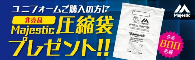 福岡ソフトバンクホークスオフィシャルグッズショップ ダグアウト ヤフオクドーム店、公式通販ショップ ダグアウトにて、ユニフォーム1枚購入で【非売品】Majestic圧縮袋1枚をプレゼント!旅行や収納に便利なアイテムです。この機会をお見逃しなく♪