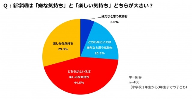 小学校1年生から3年生の子どもに対して、学年が上がる新学期に「楽しみな気持ち」と「嫌だなと思う気持ち」のどちらの方が大きいかを尋ねたところ、「嫌だなと思う気持ちのほうが大きい」と回答した人は全体の26.3%(「嫌だなと思う気持ちのほうが大きい」6.0%、「どちらかといえば嫌だなと思う気持ちのほうが大きい」20.3%の合計)にのぼった。「楽しみな気持ちのほうが大きい」と回答した子どもは、全体の73.8%(「楽しみな気持ちのほうが大きい」29.3%、「どちらかといえば楽しみな気持ちのほうが大きい」44.5%の合計)であった。
