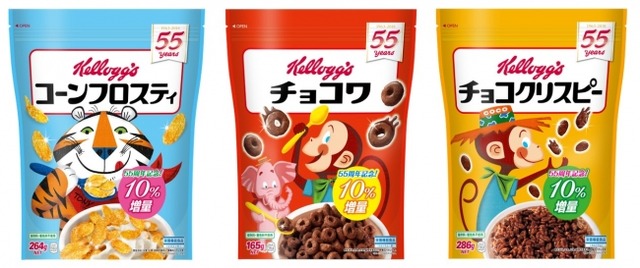 おいしさにこだわり、栄養バランス満点のケロッグのシリアルは、忙しい朝でも手軽に朝食の準備ができ、気持ちのよい一日のスタートをサポートします。ビンテージパッケージの発売に伴い、「コーンフロスティ」、「ココくんのチョコワ」、「ココくんのチョコクリスピー」の3製品の内容量を数量限定で10%増量いたします。「コーンフロスティ」は通常の240gから264gに、「ココくんのチョコワ」は150gから165gに、「ココくんのチョコクリスピー」は260gから286gとなります。