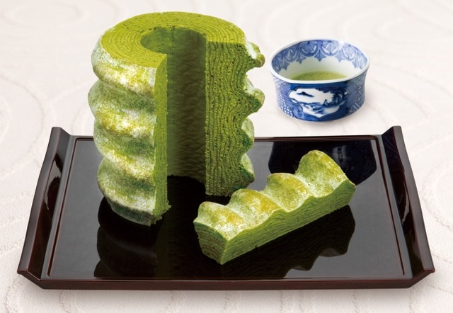 京都宇治抹茶をとろりと練りこみ、通常のバームクーヘンの倍近い時間をかけてじっくり焼きあげた生地を、静