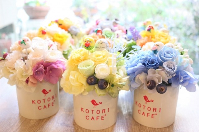 癒されるプリザーブドフラワーの隙間からちょこんと覗く小鳥さん達がきっと大切なお母さんの心も温かくしてくれます。店舗販売は箱にリボンアレンジ、通販では箱に熨斗帯(数種類から選べます)をお付けします。今後も「ことりカフ ェ」通販サイト(https://store.shopping.yahoo.co.jp/kotoricafe/)では、 小鳥雑貨をはじめ、“鳥”をモチーフにしたスイーツやコラボ商品・オリジナル商品など、愛 鳥家をはじめ、雑貨好き、スイーツファンの方々にも楽しんでいただける商品の開発、サ ービス提供を目指してまいります。