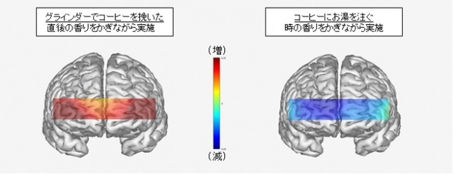 計算課題を行う際、被験者9名全員が、コーヒーにお湯を注ぐ際に発生する香りをかぎながら取り組んだ時よりも、グラインダーで豆を挽いた直後に発生する香りをかぎながら取り組んだ時の方が、脳の前頭葉部分の脳血流増加量が高いという結果になりました。