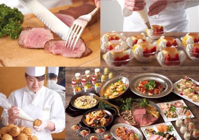【メニュー例】ローストビーフ(カッティングサービス)/パルミジャーノパスタ/刺身の船盛り/ブイヤベース/牛頬肉の赤ワイン煮/鱸のパイ包み焼き/エビのアヒージョ/スパニッシュオムレツ/ちらし寿司/お子様コーナー(のり巻き・ハンバーグ・マカロニグラタン・ナポリタンなど)