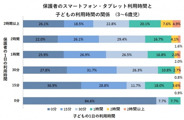 調査の結果から、保護者のスマートフォン・タブレットの1日の利用時間が長くなるにつれて、子どもの利用時間も増加する傾向が明らかにみられました。たとえば、保護者が1時間利用している場合、その子どもが1時間以上利用する割合は20.8%ですが、保護者が2時間以上使用している場合は、1時間以上利用する割合は32.6%に達しました。
