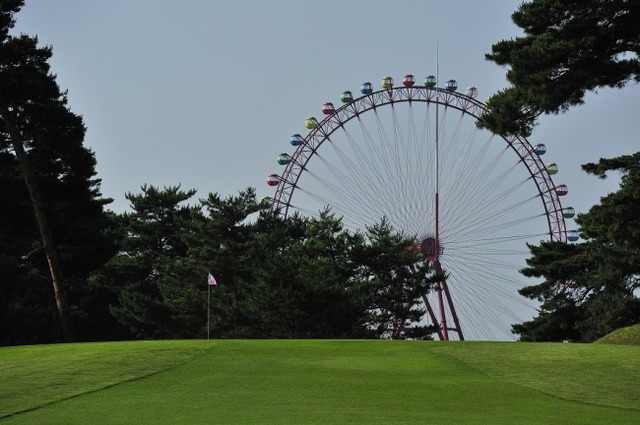 西武園ゆうえんちの観覧車が見える9番ホール