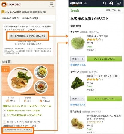 クックパッド「プレミアム献立」では、毎週日曜日に旬の食材を使った手軽で美味しいレシピを1週間分の献立リストにして提供しています。今回の連携により、献立で使用している肉・魚・野菜などの生鮮食品、味噌・しょうゆなどの調味料を、Amazonフレッシュのショッピングカートにまとめて追加、購入することが可能になりました。