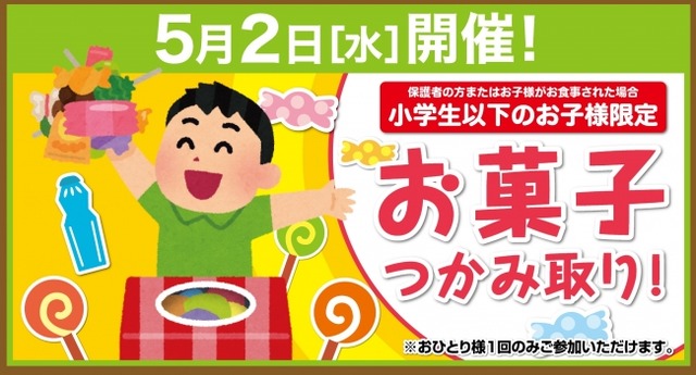 内 容 : 保護者の方またはお子様がお食事をされた方限定で、小学生以下のお子様に「お菓子のつかみ取り」に挑戦していただきます。