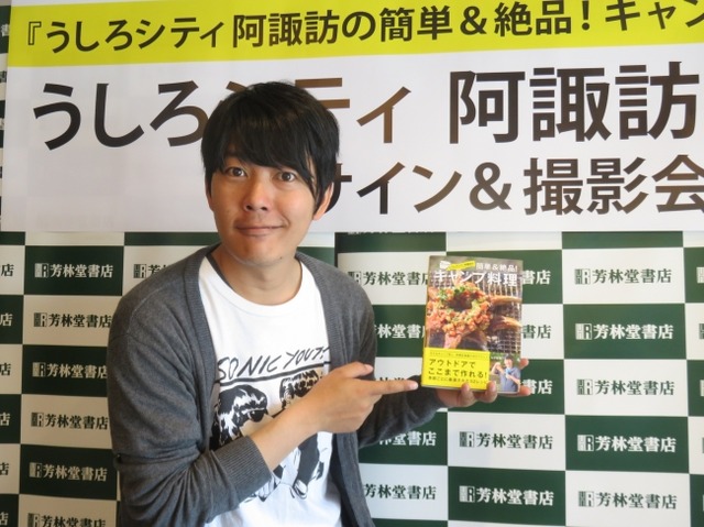 料理芸人としておなじみのうしろシティ阿諏訪さんがガチでハマっているキャンプを活かし、“簡単&おいしく”作れるアウトドアレシピをまとめた本『うしろシティ阿諏訪の簡単&絶品!キャンプ料理』が、4月11日にぴあ株式会社より発売。これを記念してサイン&撮影会イベントを芳林堂書店高田馬場店にて本日4月21日に行いました。