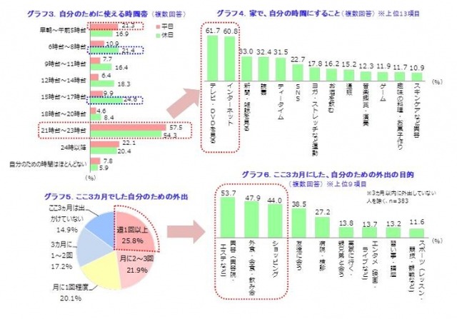 自分の時間は、平日が平均64分、休日が平均97分。理想は、平日が平均120分、休日が平均165分で、実態との差は平日・休日とも約1時間。自分のために使える時間帯(グラフ3)は、平日・休日ともに「21時台~23時台」が5割超。平日は「早朝~午前5時台」「24時以降」も各2割超います。家で、自分の時間にすることは、「テレビ・DVDを見る」「インターネット」が各6割超と圧倒的(グラフ4)。