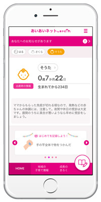 吉富町に採用された『あいあいネット』は、スマートフォン・タブレット端末・PCに対応したサービスで、妊産婦と子どもの健康データの記録・管理や予防接種のスケジュール管理、出産・育児に関するアドバイスの提供など、育児や仕事に忙しい母親や父親を助けてくれる便利な機能が充実しています。