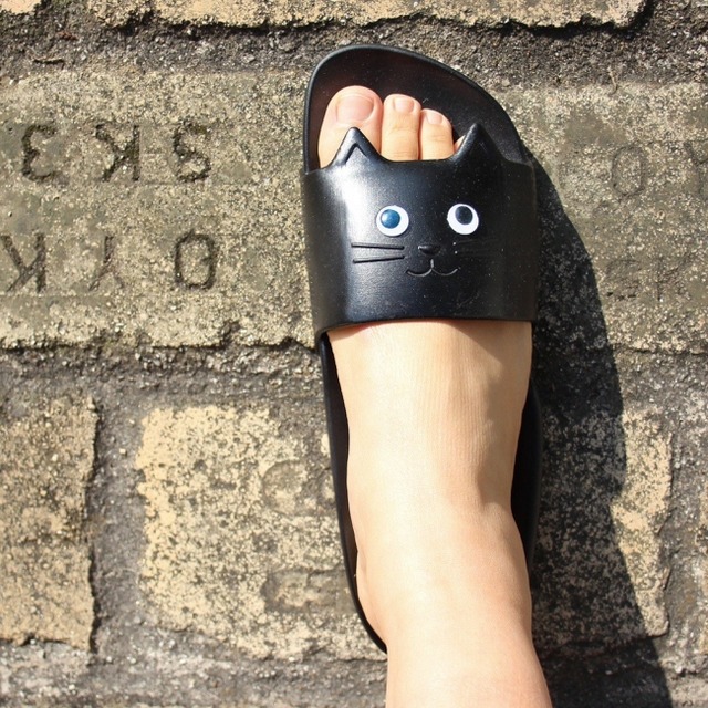EVA素材で軽くて履きやすいから、1年中どこでもお出かけのお供に連れ出せます。ちょっと歩き疲れたときは足元に目を落とすと、ネコちゃんと目が合って癒されます。裏底はネコの肉球柄になっているから、土や砂の上を歩いたりしてふと振り返ると、そこにはネコの足跡が。