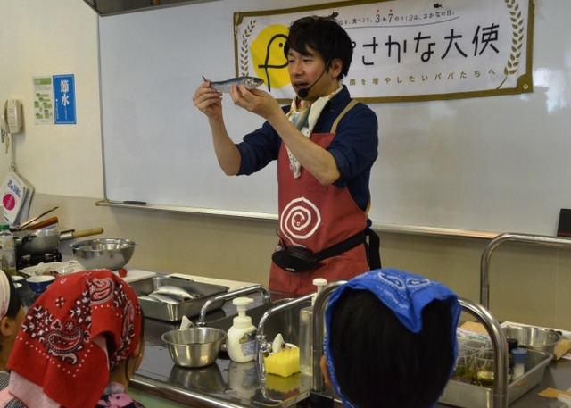 食卓で魚食を推進していくための「パパさかな大使」プロジェクト発足後、初のイベント「春のパパ小魚料理教室」が4月21日、東京都品川区の区立総合区民会館で行われました。親子10組22人が参加、パパ料理研究家で、パパさかな大使代表の滝村雅晴さんとともに、4品を作り上げました。パパさかな大使は公式サイトで簡単な「検定」に合格すると就任することができます。魚料理の腕前を上げるため、パパ力向上のために、パパさかな大使検定に挑戦してみてはいかがでしょうか。