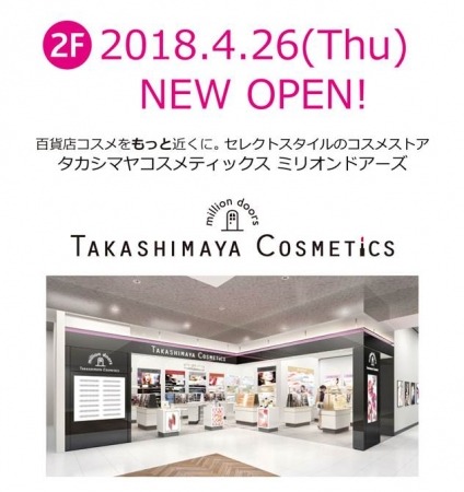 2018 年 4 月 26 日(木)有楽町マルイ 2 Fに 「タカシマヤコスメティックス ミリオンドアーズ」がオープンいたします。 人気のコスメブランドをブランドの枠を超えて自由に試せて、ご購入いただけるセレクトスタイルのコスメショップです。 憧れのブランドや、よりお買物を楽しんでいただけるうれしいサービスを取り揃えて、皆さまのお越しをお待ちしております♪