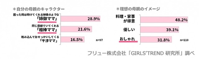 なお、理想の母親のイメージとしては、「料理・家事が得意」(48.2%)、「優しい」(39.1%)、「おしゃれ」(31.8%)が上位3位に入りました。見た目に関する「おしゃれ」という要素が3位にランクインしたのは、友だちや姉妹のような母娘が多いことが影響したのかもしれません。