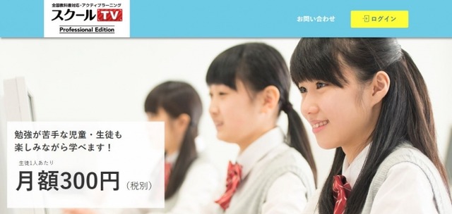 「スクールTVプロフェッショナルエディション」は、全国の主要科目の教科書内容を網羅した小中学生向けの動画教育サービスです。約1,000本の教科書に対応した授業動画を配信し、自ら能動的に学習する「アクティブ・ラーニング」のメソッドを日本で初めて動画内に導入しています。授業動画を視聴中に、動画に連動した問題が出題されるインタラクティブなドリルを提供することにより、勉強が苦手な子どもたちでも飽きずに授業動画を視聴できるように設計されています。