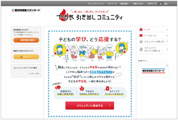 このたびの「やる気 引き出し コミュニティ」は、保護者同士が、我が子の学びに関する悩みについて語り合える会員登録無料のオープン型コミュニティです。
