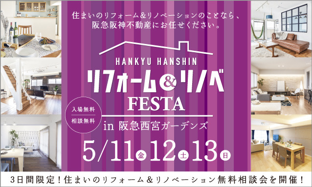 2018年5月11日(金)・12日(土)・13日(日)阪急西宮ガーデンズにて「リフォーム&リノベFESTA」を開催いたします。