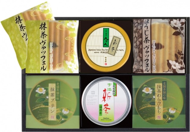 宇治新茶八十八(金)40g缶入、宇治新茶ほのか40g缶入、抹茶ヴァッフェル(2枚)、