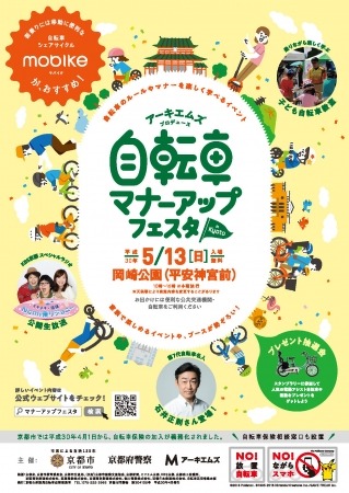 株式会社アーキエムズ(本社:京都市中京区、代表取締役社長:村田雅明 以下アーキエムズ)は、「アーキエムズプロデュース 自転車マナーアップフェスタin Kyoto 以下マナーアップフェスタ」を、京都市・京都府警と共同で主催し2018年5月13日(日)に京都市左京区の岡崎公園にて開催いたします。放置自転車のない京都の街づくりに貢献したいというアーキエムズの思いと、ルール・マナーの「みえる化」を進める京都市及び、自転車の安全利用を推進する京都府警察との三者の意向が合致し、自転車のルールやマナーを楽しみながら学べる参加・体験型イベントとして5回目となるマナーアップフェスタを行います。