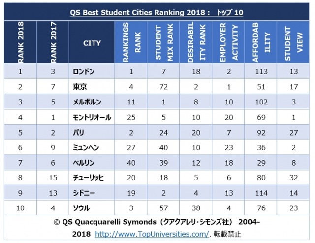 ロンドン、2018年5月 8日: 世界的な高等教育機関の調査会社であるQS Quacquarelli Symonds(キューエス カッカレリ シモンズ)社が発表したQS Best Student Cities Rankingにおいて、東京が魅力的な留学先都市として過去最高の第2位にランクインしました。QS Best Student Cities Rankingは今回で5回目となりますが、東京は前回の7位から大きく順位を上げて1位のロンドンに次ぐ結果となりました。