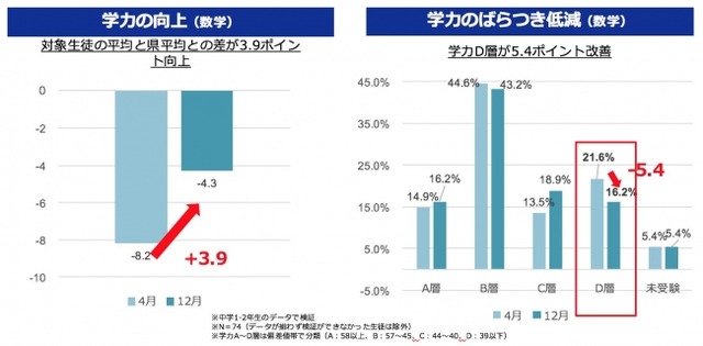 佐賀県武雄市では、市内すべての小学校・中学校の全児童・全生徒に1人1台の専用タブレットを整備し、子どもたちがいつでもどこでも学べる環境を提供しています。2017年5月より、武雄市内の中学校2校において、『スタディサプリ』を活用し、個人の習熟度に合わせて学習内容を提供するパーソナライズドラーニングの手法を取り入れるとともに、学習の状況や理解度を踏まえ、個々に適切なアドバイスを実施し、学力・学習意欲の向上を図っています。今回、2017年12月にその効果検証を行ったところ、学力の向上とばらつき低減傾向がみられました