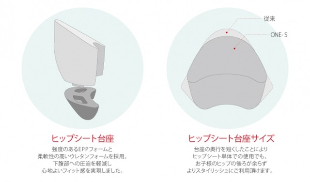 台座の奥行を短くしたことによりヒップシート単体での使用でも、お子様のヒップの後ろが余らずよりスタイリッシュにご利用頂けます。