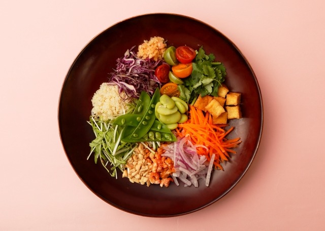 彩り豊かな野菜にピーナッツ、キヌアや干しエビ、スパイス&ハーブが香る鳥挽肉など食材12種に麺を加えた混ぜ麺料理です。ライムが爽やかに香るビネグレットソースをかけ、最初にしっかりと和えてから食べます。たくさんの食材がソースと絡みあい深い味わいに。様々な野菜と食感で、最後まで飽きることなくペロリと食べられます。