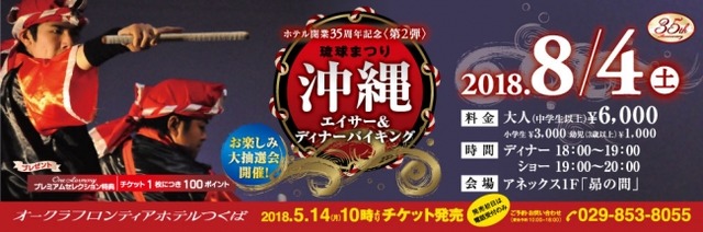 オークラフロンティアホテルつくば(所在地:茨城県つくば市吾妻1-1364-1、総支配人:高田浩)では、2018年8月4日(土)に開業記念イベントの第2弾として「琉球まつり 沖縄エイサー&ディナーバイキング」を開催いたします。