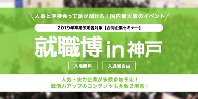 株式会社学情(本社:大阪市北区/東京都中央区、代表取締役社長:中井清和)は、日本最大級の就活イベント「就職博」シリーズを今年も全国で展開。業界を代表する企業から地元の隠れた優良企業まで、出会える企業の数と種類は日本最大級の規模。今回は神戸で開催!関西を中心とした優良企業が集結します。
