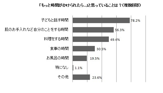 平日の働くママのスケジュールは分刻み。特に夜は仕事から帰ってから夕食を作って、お風呂に入れ、寝かしつけ…とバタバタ過ごしています。そんな毎日の中で「もっと時間がかけられたら…」と思っていることを尋ねると、78.2%が「子どもと話す時間」と答えました。中には「なかなか子どもが思っていることを言ってくれない」(37歳)と悩むママも。