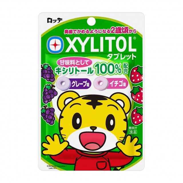 ロッテは、5月22日に大人気キャラクターしまじろうをパッケージにデザインしたキシリトールタブレットを発売いたします。歯みがきの後のごほうびとしても食べられるキシリトールタブレットが、2種類の味を選びながら食べることができるアソートタイプにパワーアップします。子どもたちが好きな味を独自調査し、人気のグレープ味とイチゴ味を採用。パッケージデザインは元気なしまじろうと2種類のフルーツのシズルで楽しさを演出しました。甘味料としてキシリトールを100%配合したタブレットを親子でぜひお楽しみください。