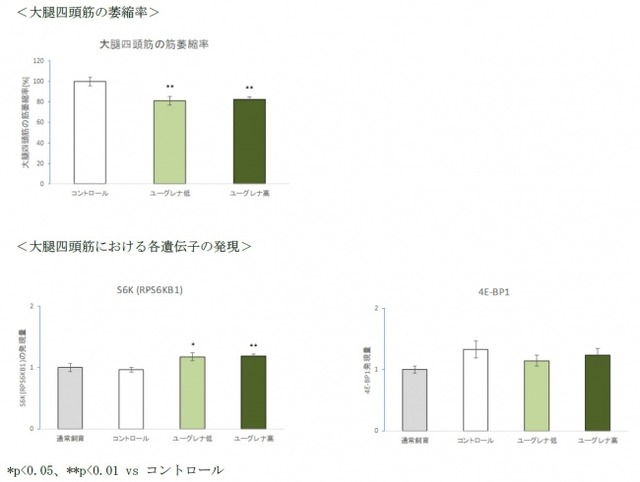 ユーグレナ粉末を事前に摂取させていたマウス(ユーグレナ群)と、通常の食事を摂取させていたマウス(コントロール群)を廃用性筋萎縮(寝たきりなどで筋肉を使わないことにより筋萎縮状態にすること)にして、大腿四頭筋の筋肉量の測定により萎縮率を確認しました。また、大腿四頭筋の筋肉量は、筋タンパク質の合成と分解の繰り返しにより制御されていることから、筋タンパク質の合成の促進(S6K)、合成の阻害(4E-BP1)に関わる遺伝子の発現量を測定しました。