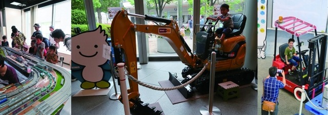 フォークリフト、ミニ油圧ショベル、ターレーの実物を展示します。力持ちののりものと写真を撮りましょう。