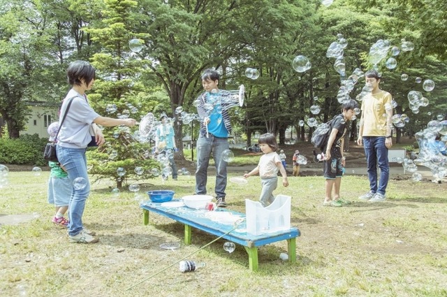 「sotomo」は、そのような社会情勢や、外での遊び方がわからない子育て中のママ・パパの悩みを背景に、親子や子ども同士で簡単に楽しめる外遊びレシピを提供するWebサービスとして、2017年4月よりオープンいたしました。今回はサイトオープン後初のリアルイベントとして、特定非営利活動法人「日本冒険遊び場づくり協会」協力のもと、「シャボン玉パーク」を実施いたしました。イベントでは、子どもたちがプレイパーク担当者にシャボン玉づくりのコツを聞きながら、自由にシャボン玉遊びを満喫。巨大なシャボン玉作りや、ペットボトルを使用した「モコモコ シャボン玉」作りに挑戦する中で、子どもたちが自ら工夫を凝らしたり、友達と協力する姿も見受けられました。
