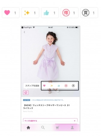 「商品スタンプ」は「ハート」「キラキラ」「いいね」「得」「買」の全5種類。ユーザーが販売商品に対して思った感情をスタンプで表現できるサービスです。ユーザーが押したスタンプはリアルタイムに反映されるので、忙しいママ同士が感情を共有できる役割も果たします。