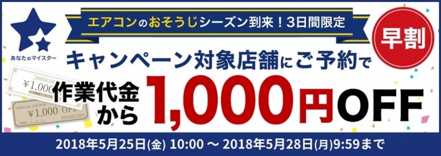 ユアマイスター株式会社(本社:東京都渋谷区、代表取締役社長:星野貴之、以下:ユアマイスター)は本日から、当社が運営するサイト『あなたのマイスター』にて、エアコンクリーニングなどを対象とした「梅雨前かけ込みキャンペーン(以下、本キャンペーン)」を期間限定で開始しますことをお知らせいたします。本キャンペーンは、5月25日(金)10:00~28日(月)09:59までの期間で実施します。
