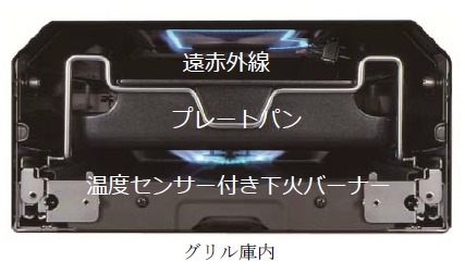 グリル庫内 ‟マルチグリル“は、業界で唯一、「温度センサー付き下火バーナー」を搭載、きめ細かな温度管理で多彩な調理が楽しめます。また、付属のプレートパンで調理する5種類のオートメニューや焼く、あたためる、ノンフライ、煮る、蒸す、パンなどの調理モードで多彩なメニューに対応します。食材を裏返したり、火加減を調節したりする手間もなく、グリルにおまかせで、誰でも簡単に一品を作ることができます。