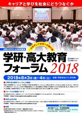 株式会社 学研ホールディングス(東京・品川/代表取締役社長:宮原博昭)のグループ会社、株式会社 学研アソシエ(東京・品川/代表取締役社長:中村雅夫)は、高校・大学の教員を対象に「学研・高大教育フォーラム2018」を開催いたします。このイベントは、過去6年にわたり開催された「高校教育フォーラム」を引き継ぐもので、「学びとキャリア教育」をベースに、高大の接続をより明確にしたイベントです。