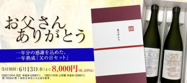 父の日のために、WHJコレクションは一年熟成のお酒「2901004 花巴 無濾過生原酒 中汲み(28BY)」と、「3601006 三芳菊 無濾過生原酒 中汲み(28BY)」の2本をチョイスしました。