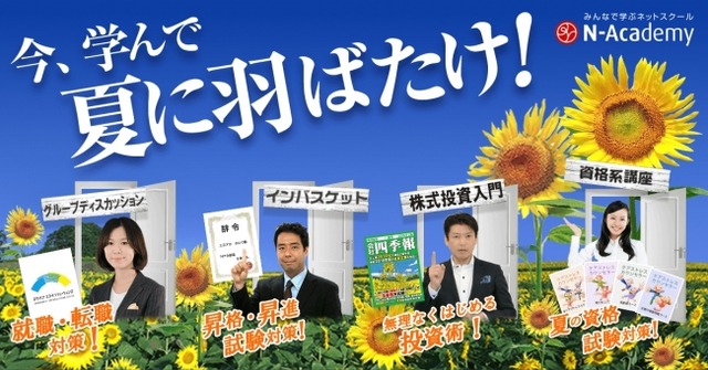 株式会社デジタル・ナレッジが運営する、会員数23万人超を誇る国内最大級のネットスクール「N-Academy(エヌ・アカデミー)」は、『今、学んで夏に羽ばたけ!6月キャンペーン』を6月1日(金)より開始いたしました。対象講座は、『グループディスカッション対策講座』、『インバスケット入門講座』、『株式投資入門講座』、『ヒューマン資格講座全14講座』。就職や転職、昇格・昇進試験対策に役立つお勧めの講座が揃っています。
