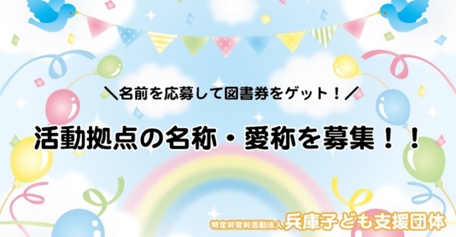 特定非営利活動法人兵庫子ども支援団体(所在地:兵庫県明石市、代表理事:多田実乘、以下「当法人」という)は、2018年8月にオープンする活動拠点の名称・愛称を2018年6月4日(月)より募集いたします。最優秀賞1名・優秀賞2名の方には、図書券をプレゼントいたします。
