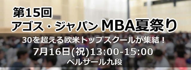 海外トップ大学・大学院留学準備指導校を運営する株式会社アゴス・ジャパン(代表取締役:横山 匡、本社:東京都渋谷区)は、2018年7月16日(月・祝)に、ハーバード、スタンフォード、オックスフォード、ケンブリッジ、INSEAD等、30校を超える欧米MBAトップ校の日本人卒業生・在校生が集結する第15回「アゴス・ ジャパン MBA夏祭り」を開催いたします。