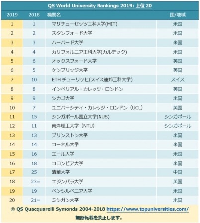 世界的に見ると、マサチューセッツ工科大学が7年連続で世界1位、アジアではシンガポール国立大学(世界11位)が最高順位となった。現在QSは、85カ国に渡る世界上位1,000校の大学をランク付けしており、
